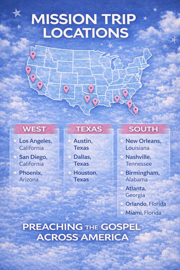 During this mission trip, we will be travelling across multiple states and cities to preach the Gospel, pray for the broken, and share the love of Jesus. Travelling across America to 8 different states and 12 cities.